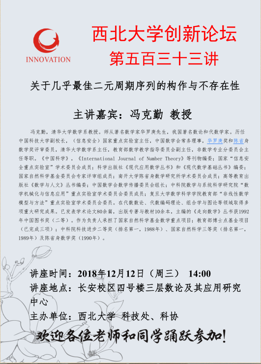 西北大学创新论坛第五百三十三讲:关于几乎最佳二元周期序列的构作与不存在性