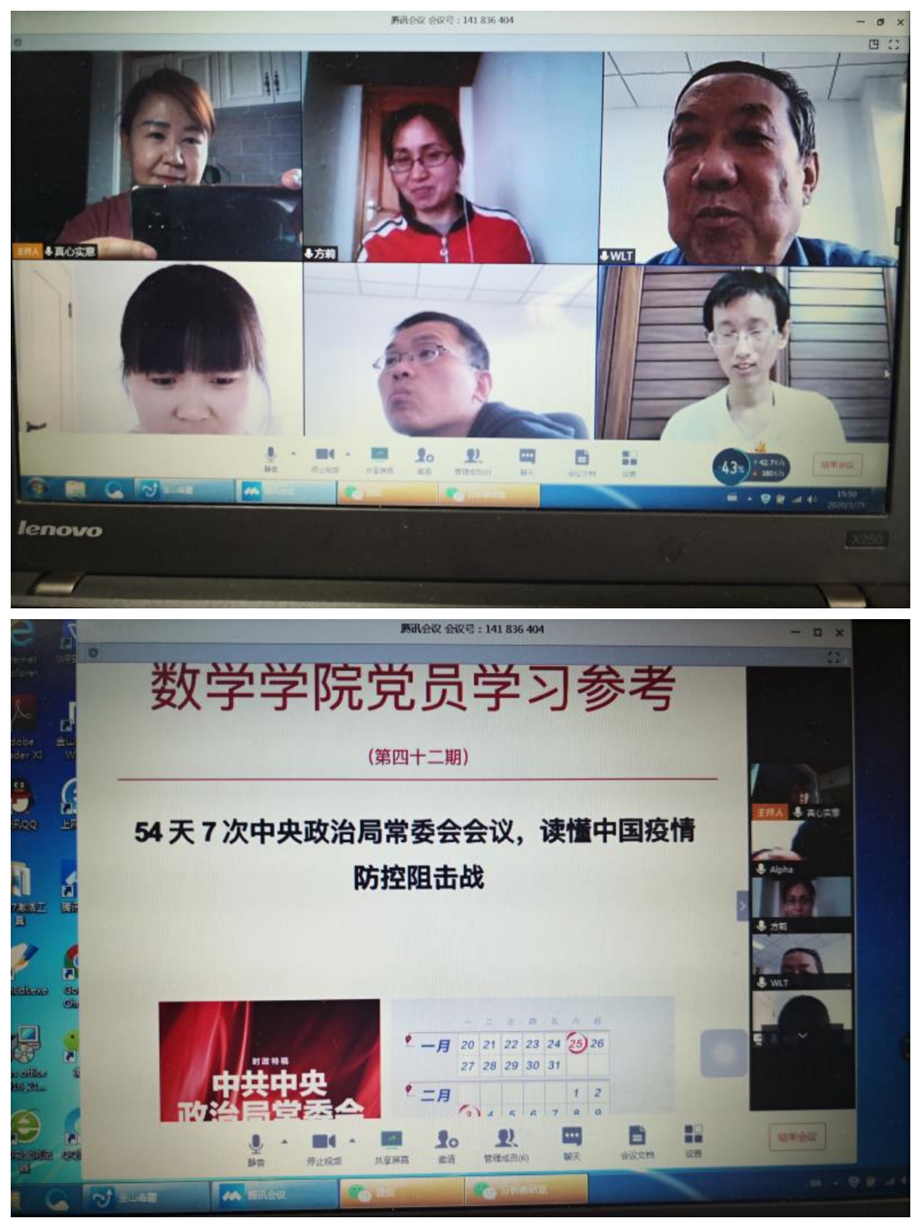 代数与数论教研室党支部、金融数学党支部召开网络组织生活会,分享疫情期间所见所闻、所为所获、所思所悟,党员一致认为这次疫情既是对党和国家、民族和人民的考验,也是中国凝心聚力、走向世界舞台中央的的机遇,各位老师要积极主动适应线上教学,讲好专业课,上好课程思政课,为疫情防控贡献思想动员和教学科研力量!