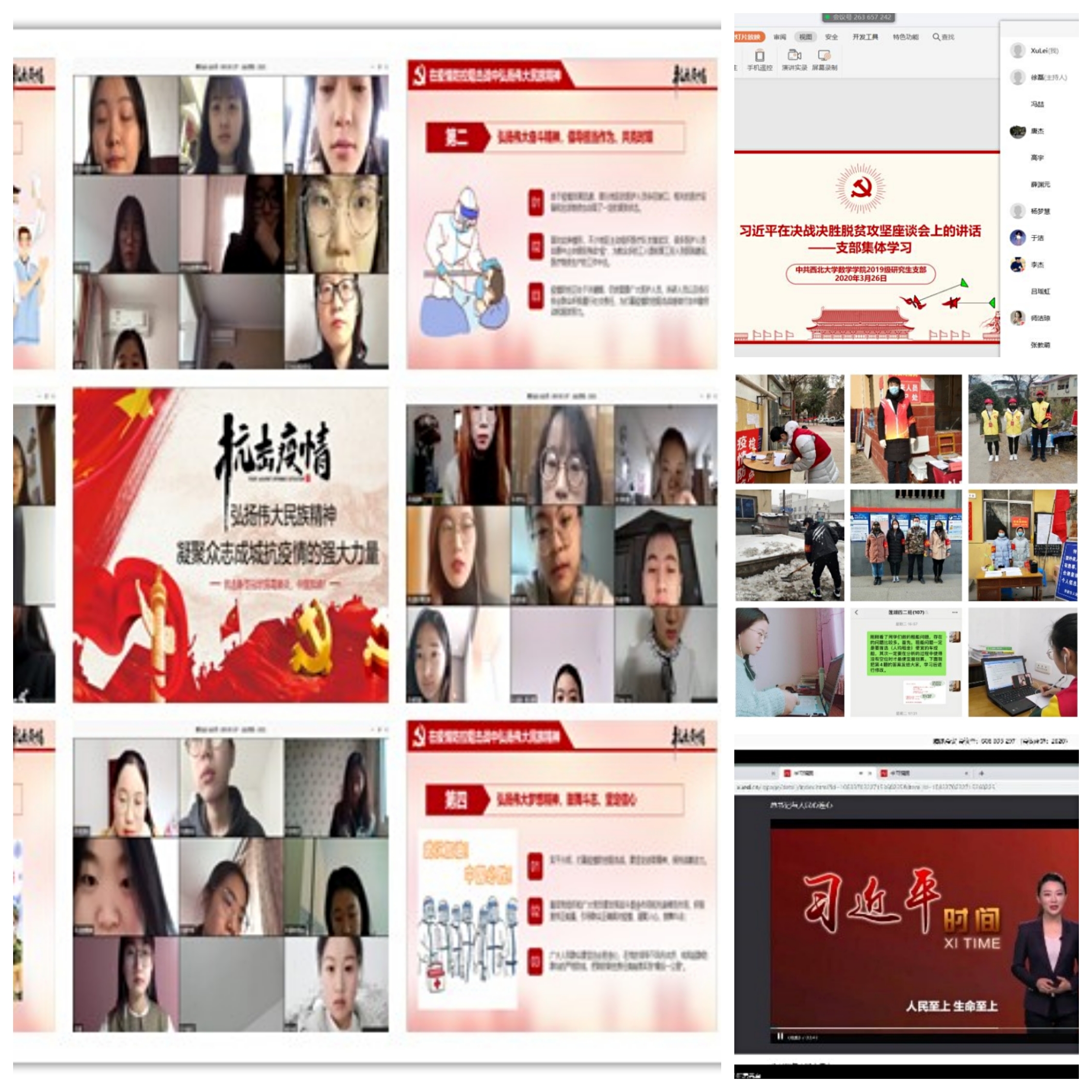 各学生党支部在学院的统一安排部署下,不仅开好线上组织生活会,还充分利用“全国大学生同上一堂疫情防控思政大课”、陕西广电网络“停课不停学,战‘疫’课堂”、西北大学“开学第一课”和青马工程线上讲座等优质的线上教学资源,开展支部党员学习交流活动,引导学生做到“两个维护”、增强“四个意识”、坚定“四个自信”、做到“四个正确认识”。本科生党支部召开线上理论学习会,集体学习光明日报题为《弘扬伟大民族精神凝聚众志成城抗疫情的强大力量》的文章,并观看《习近平时间》、《习近平的足迹》两部视频,引导支部党员坚决贯彻落实习近平总书记重要讲话、重要指示精神,弘扬中华民族的伟大民族精神,增强向心力、凝聚力和战斗。2018级研究生党支部先后开展习近平总书记关于疫情防控重要批示指示精神、习近平总书记的战“疫”方略等专题学习会,支部党员畅聊心得体会,并提交学习感想。2019级研究生党支部集体学习2020年3月6日习近平总书记在决战决胜脱贫攻坚座谈会上的讲话,坚定了全体党员对中国在严峻疫情形势下夺取脱贫攻坚战全面胜利的信心。特别地,部分学生党员、入党积极分子知行合一,深入开展社区服务、线上教学志愿服务活动,产生积极良好的社会影响。