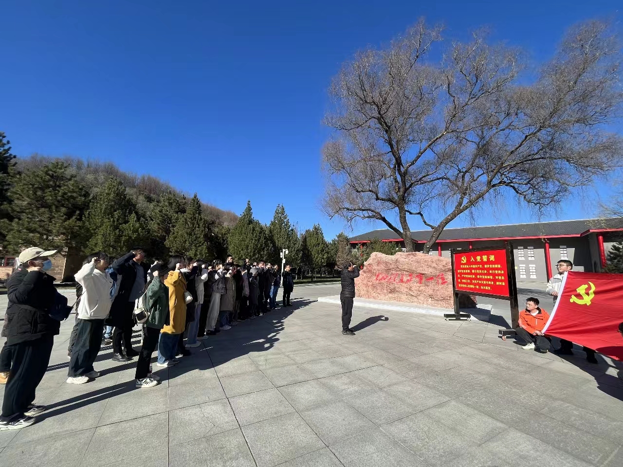 在马栏革命纪念馆前,图书馆党支部书记刘小光带领师生党员重温入党誓词。全体党员肃立,面向中国共产党党旗,大家庄严地举起右手,重温入党誓词,铮铮誓言,铿锵有力,铭记于心,牢记于行。