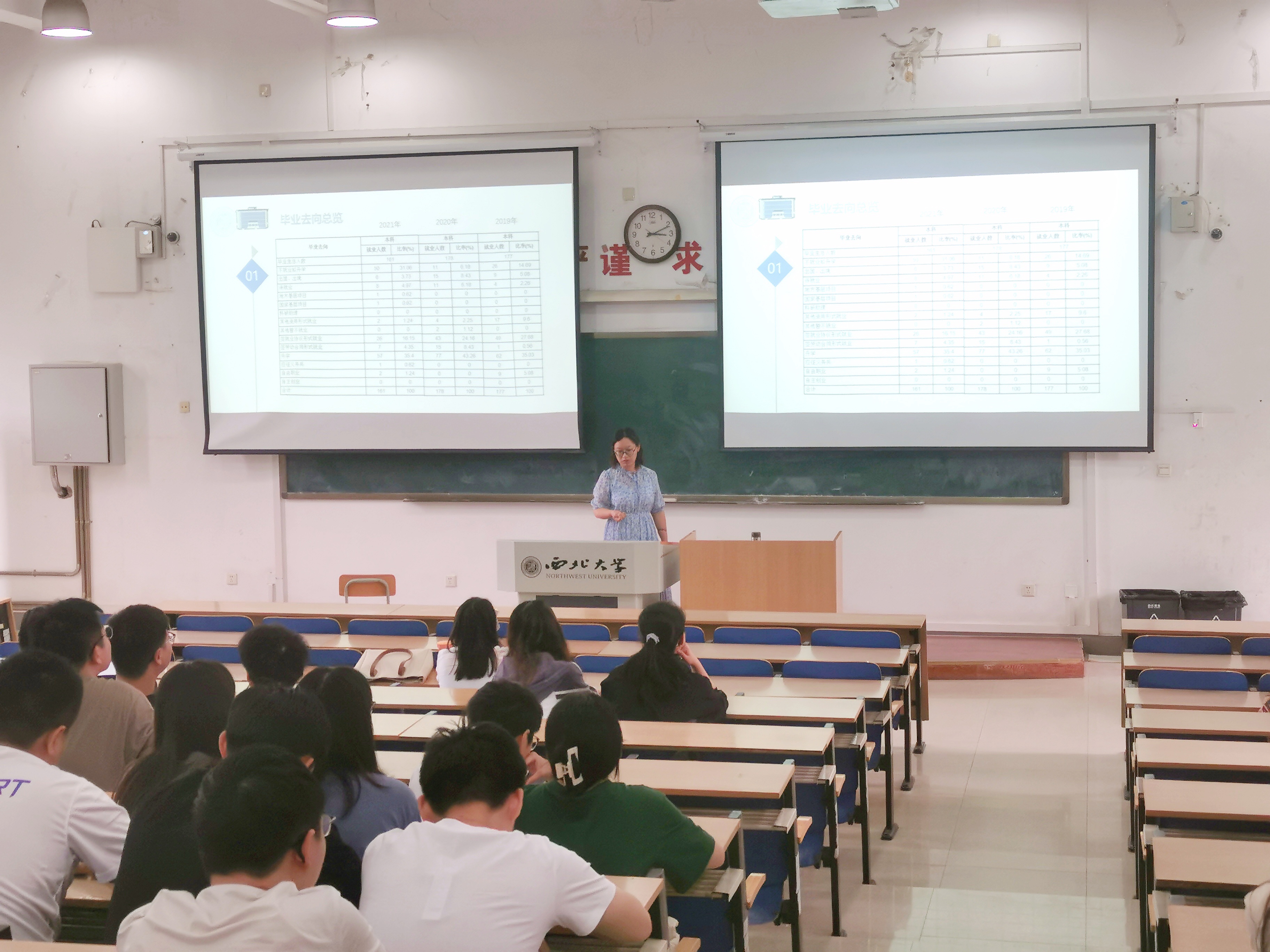 最后,周靖雯老师希望通过对过去三年本科生毕业形势的分析,引发2019级同学们对自身毕业去向的思考,进而同学们能够明确目标、踏实努力、达成所愿。