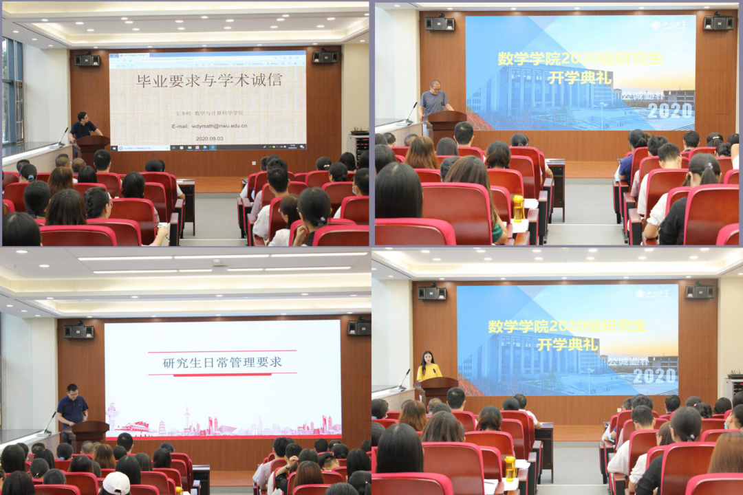 研究生学位秘书王冬岭副教授系统介绍了研究生奖学金评定、毕业基本要求、学术诚信等相关学术规章制度。辅导员李建璋老师主要从日常管理、校纪校规 、疫情防控、培养良好道德品质、遵纪守法等多个方面,给大家上了“开学第一课”。历智明副教授从班主任角度对研究生提出了建议:要心地善良、敬畏自然、 追求真理、心胸开阔、志向高远,尽快适应大学生到研究生的角色转换。2019级统计学硕士,西北大学第21届研究生支教团的成员张欣悦,作为新生代表发言。