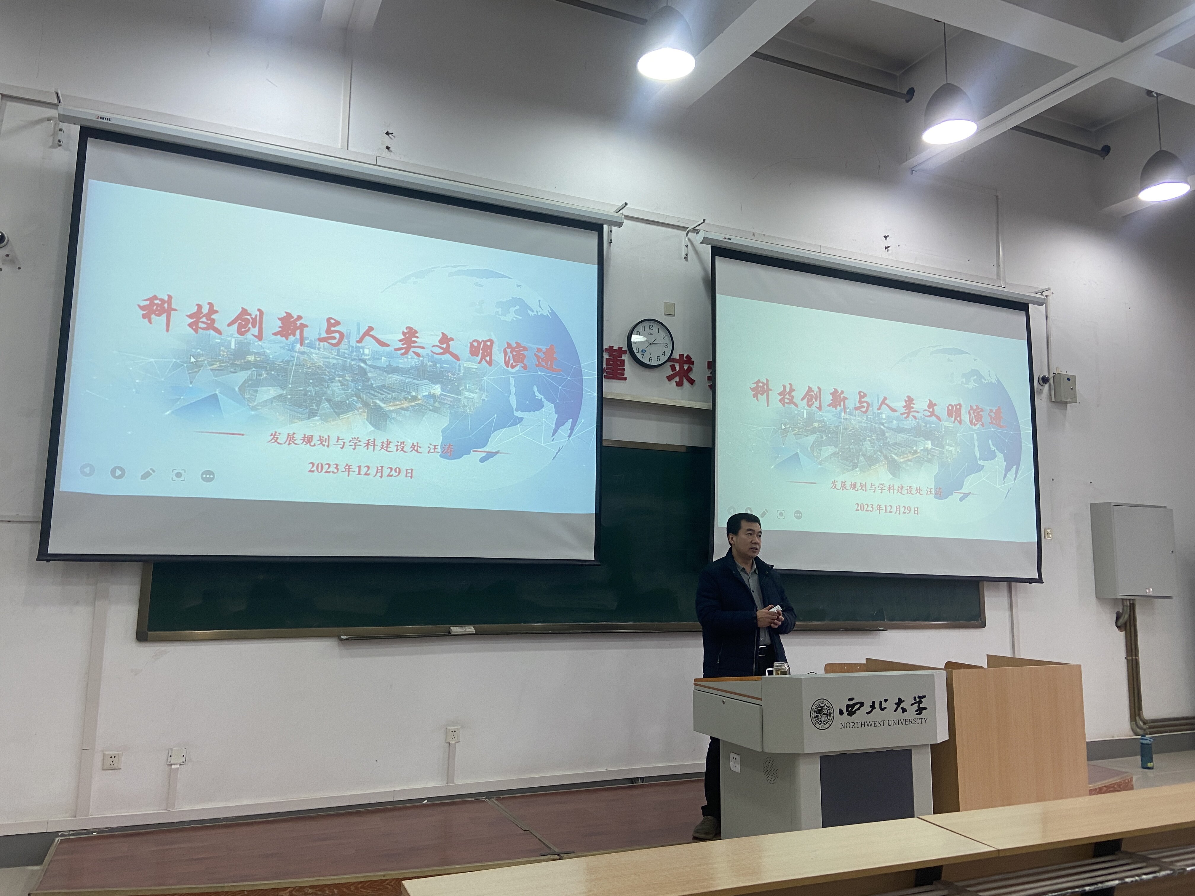 12月29日,校发展规划与学科建设处处长汪涛老师为yl88858cc永利官网学生讲授“科技创新与人类文明演进”专题形势与政策课。学院辅导员周靖雯,2023级全体本科生参加了此次课程学习。