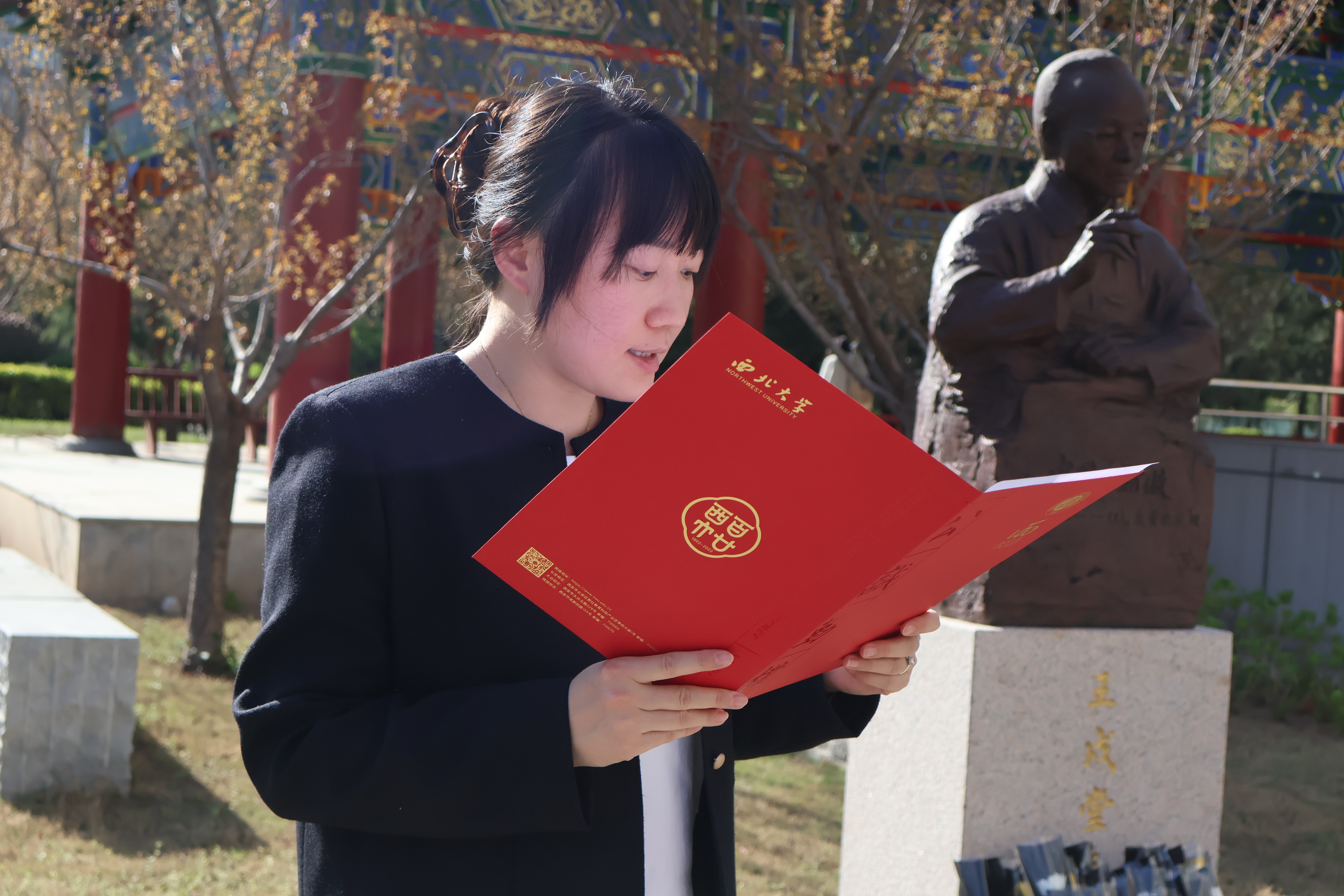 接着全体参与师生移步到王戍堂先生雕像前,共同缅怀王戍堂先生。在场师生为王戍堂先生默哀三分钟,三致深躬后依次向王戍堂先生雕像献花,以表达对先生的深切思念与敬意。