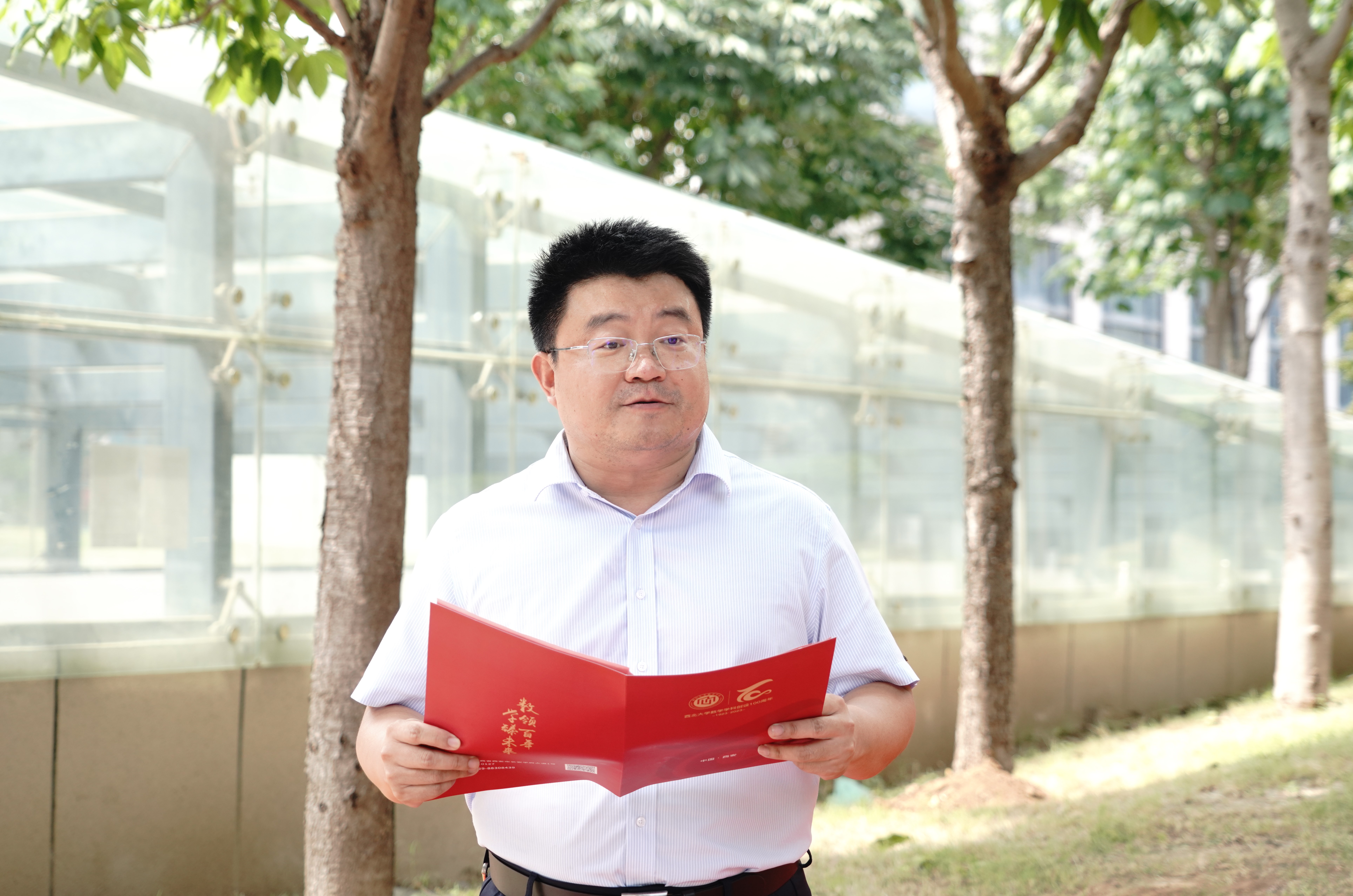 校党委常委、宣传部部长田明纲宣读了熊庆来先生铜像铭文,介绍了熊先生光荣伟大的一生。熊先生是著名数学家、教育家,中国现代数学先驱,中国函数论的主要开拓者之一。熊先生在数学领域深耕,以“熊氏无穷级”理论载入世界数学史册,为无穷级整函数、亚纯函数、代数体函数等问题的解决提供了新的视角;熊先生从云南走出,不畏艰辛,历经多次海外求学和国内工作调动,为中国数学事业默默奉献;熊先生是西大数学学科的重要奠基者,为推动中国现代数学的发展做出了突出贡献。