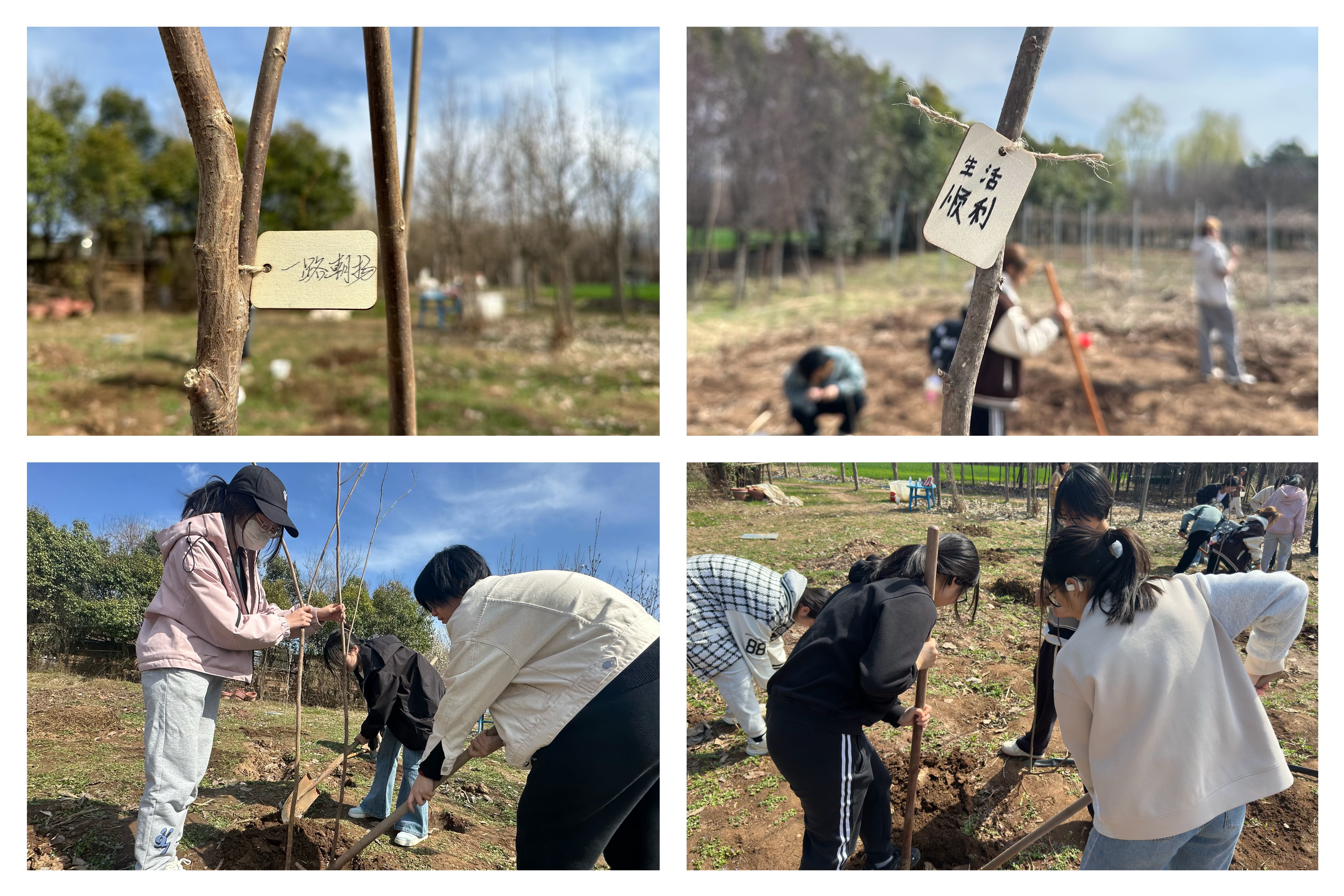 在工作人员的指导下,植树活动如火如荼地展开。同学们挥锄挖坑、搬运树苗、培土浇水,在自己栽培的树苗上写下对未来的期望,切身感受到了植树的不易,也更加懂得了劳动的意义。
