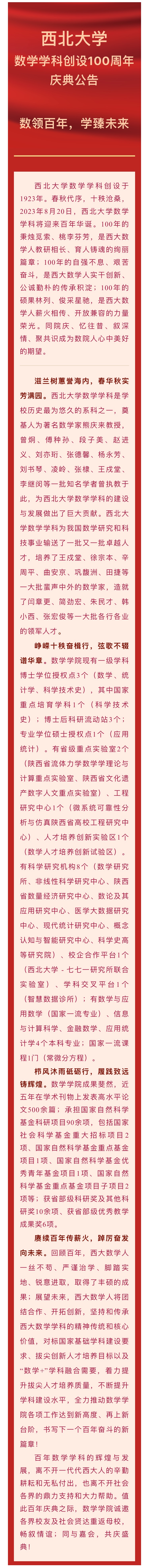 西北大学数学学科创设100周年庆典公告