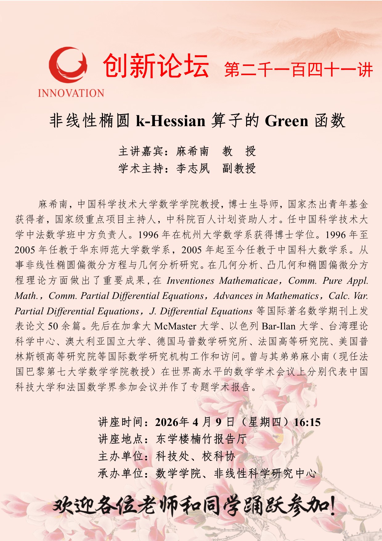 西北大学创新论坛第二千一百四十一讲:非线性椭圆 k-Hessian 算子的 Green 函数