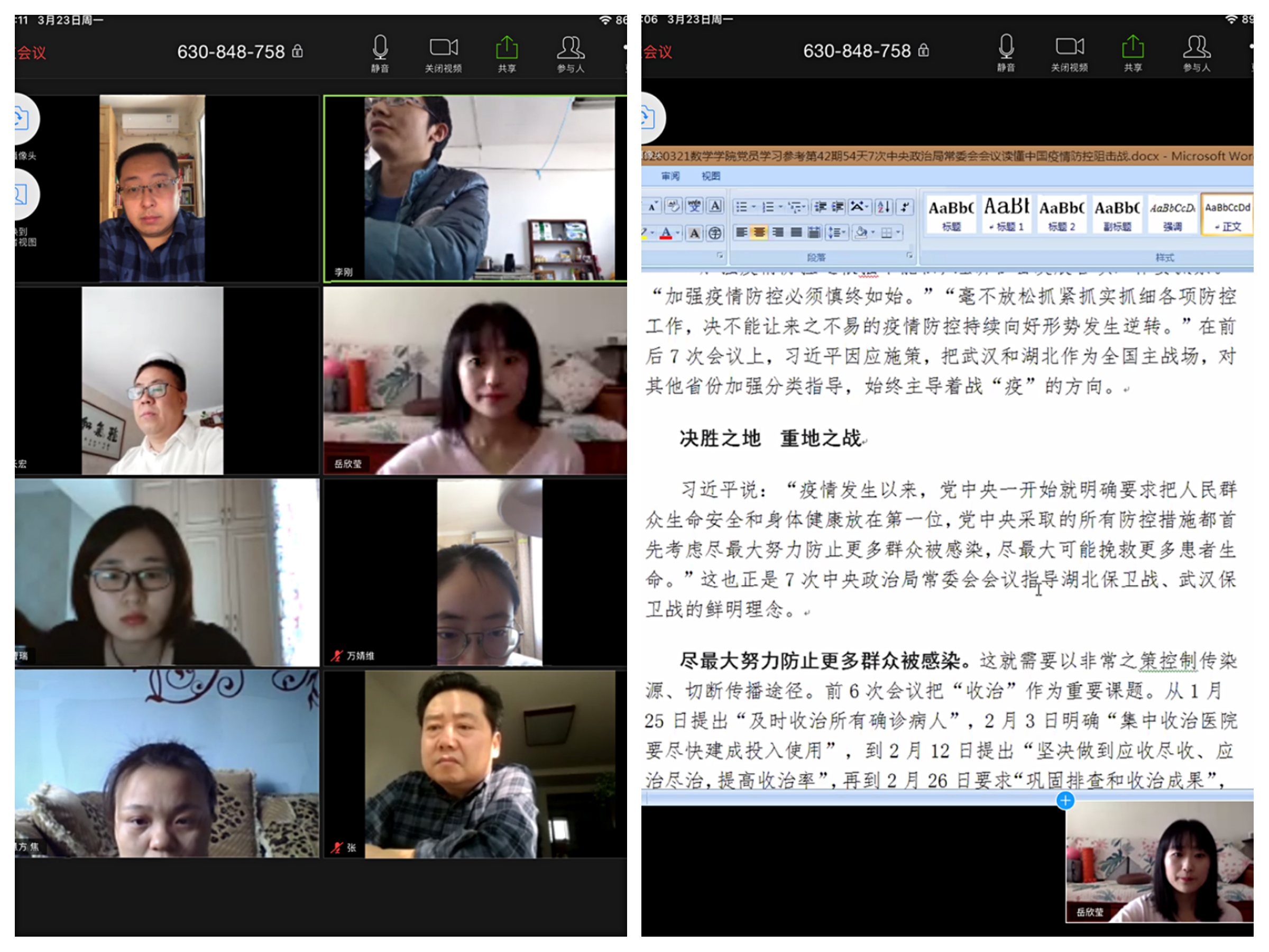 代数与数论教研室党支部、金融数学党支部召开网络组织生活会,分享疫情期间所见所闻、所为所获、所思所悟,党员一致认为这次疫情既是对党和国家、民族和人民的考验,也是中国凝心聚力、走向世界舞台中央的的机遇,各位老师要积极主动适应线上教学,讲好专业课,上好课程思政课,为疫情防控贡献思想动员和教学科研力量!