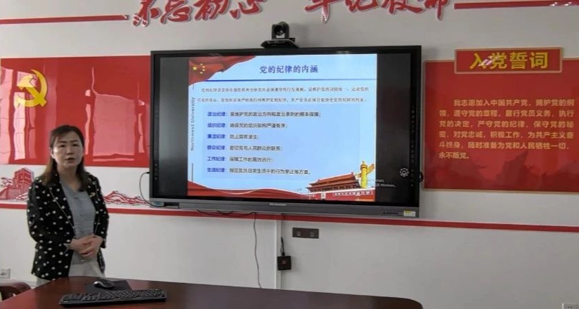 会议伊始,全体党员在鲜红的党旗下庄严宣读入党誓词,重温入党初心,强化党员意识。王丽真以“党纪学习教育”为主题上了一堂生动而深刻的党课,主要涵盖了党的纪律内涵、党纪学习教育的重要性和遵守党纪的意义等内容,党课内容丰富详实,结合与高校教师密切相关的党纪条例及相关具体案例进行讲解。