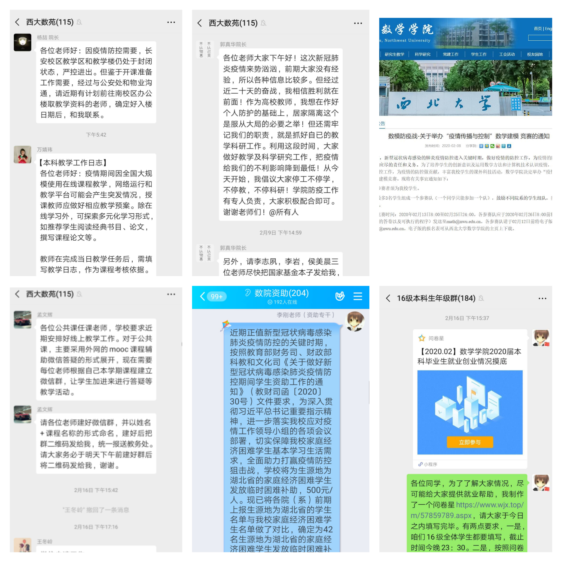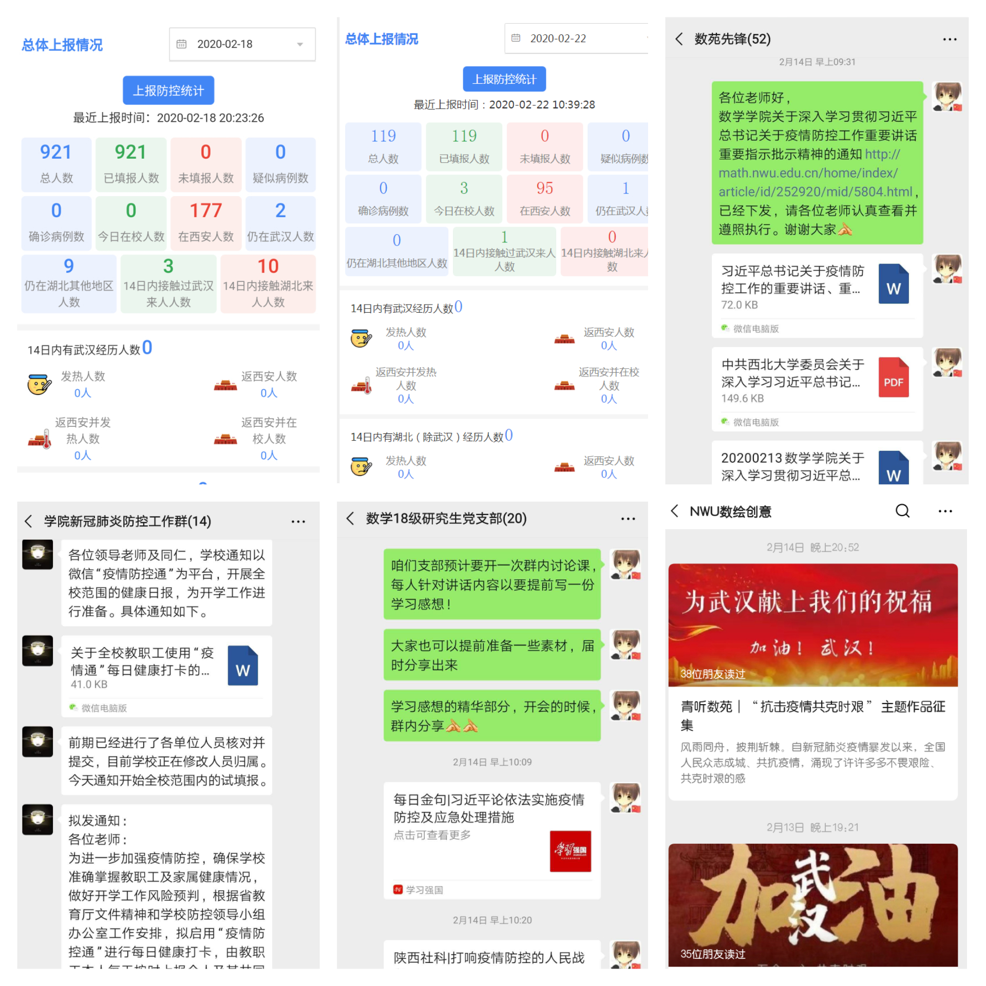 周密部署,实施精细化和网格化疫情防控举措,筑牢战“疫”防线。一是,强化组织领导,明确分工与责任,切实守好“责任田”。成立以党委书记、院长为组长的疫情防控工作组,制定疫情防控工作方案,建立联防联控工作机制。借助“疫情防控通”和“家属每日健康打卡”等方式,详细掌握记录了全体师生的健康状况;每日开展深入细致的摸排并建立台账,严格执行和落实“全覆盖、日上报”制度;重点做好11名在鄂学生、4名因封楼或同车次出现确诊病例居家隔离学生、多名出现咳嗽和发热症状学生的健康日询和心理疏导工作。二是,统一思想、凝聚共识。学院党委、各党支部组织开展“习近平总书记关于疫情防控工作重要讲话重要指示批示精神”学习教育活动,学院团委、各团支部积极开展“抗击疫情,共克时艰”线上专题团日活动,全方位、多途径教育引导全院师生不断增强“四个意识”、坚定“四个自信”、做到“两个维护”。三是,党员领导干部主动作为,勇挑疫情防护重担。学院党委第一时间建立了“学院新冠肺炎防控工作”“学院党政联席会”微信工作群等,讨论研究学院师生疫情防护工作。学院党政领导及时研究防护举措,行政教辅人员主动请缨承担疫情防护任务,工会委员积极做好居家隔离教职工的后勤保障工作,部分党支部书记和老党员多次向学院党委申请工作任务,主动给年轻教师做心理减压辅导等工作。四是,发挥学习强国、学院网站、“NWU数绘创意”微信公众号、师生微信群和QQ群等融媒体矩阵作用,积极做好全院师生的宣传教育引导工作,深入宣传党和国家重大决策部署、学校学院的疫情防控工作举措、先进典型事迹、科学防护知识,家校合力确保学生不离家不返校、停课不停学。