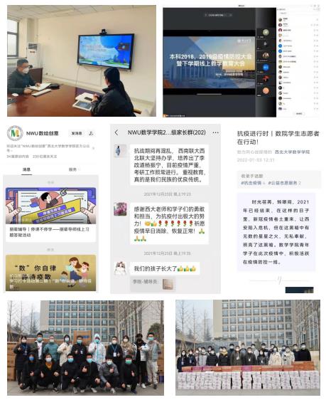 凝聚各方力量,全力构筑“学校-教师-学生-家长-校友”战疫共同体。举办疫情防控动员暨线上教学教育大会,强化安全教育,规范线上教学秩序。利用党团支部主题活动、《形势与政策》课堂等形式,以身边素材,讲清抗疫形势、讲好战疫故事。停课不停学,开展学习打卡、朋辈导师答疑等线上优良学风创建活动。借助学生家长群及时宣传学校疫情防控相关情况,动员家长鼓励学生安心。主动联系院友,87级校友赵杰代表陕西延康医药科技有限公司捐赠医用外科口罩40000个、医用防护服600套、医用橡胶手套2000付、鞋套600付、医用酒精300瓶,2003级信息与计算科学班捐赠方便面2700包、火腿肠7200根,慷慨捐赠提振抗疫信心。大力宣传师生战疫事迹,讲好身边抗疫故事,增强抗疫决心。