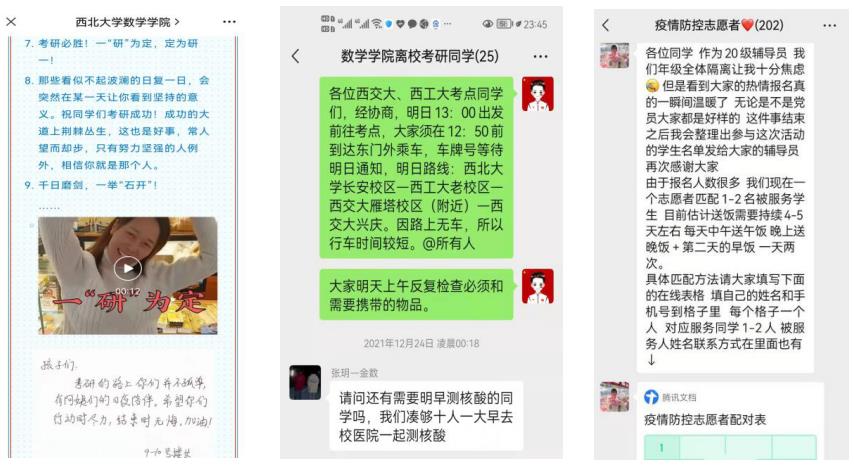 以学生诉求为抓手,在疫情防控实战中扎实推进“我为学生办实事”实践活动。学院定期召开学生工作形势研判会,制定工作预案,第一时间最大限度地解决学生急难愁盼问题。考研前夕,组织师生、学生家长、校友给考研学生送祝福、化焦虑,多名教工党员主动报名承担借考、隔离等特殊类型考生的考务任务;封城后,紧急安排专车接送23名学生赴雁塔区、碑林区、长安区等地参加研究生入学考试,确保学生和家长无后顾之忧。在C类密接、黄码以及其他管控学生隔离期间,统筹安排师生志愿者为160余名学生提供点对点无接触送餐服务。开辟特殊管理服务通道,解决药品短缺、定期肾透析(2次/周)等特殊学生就医困难,确保学生生命健康。