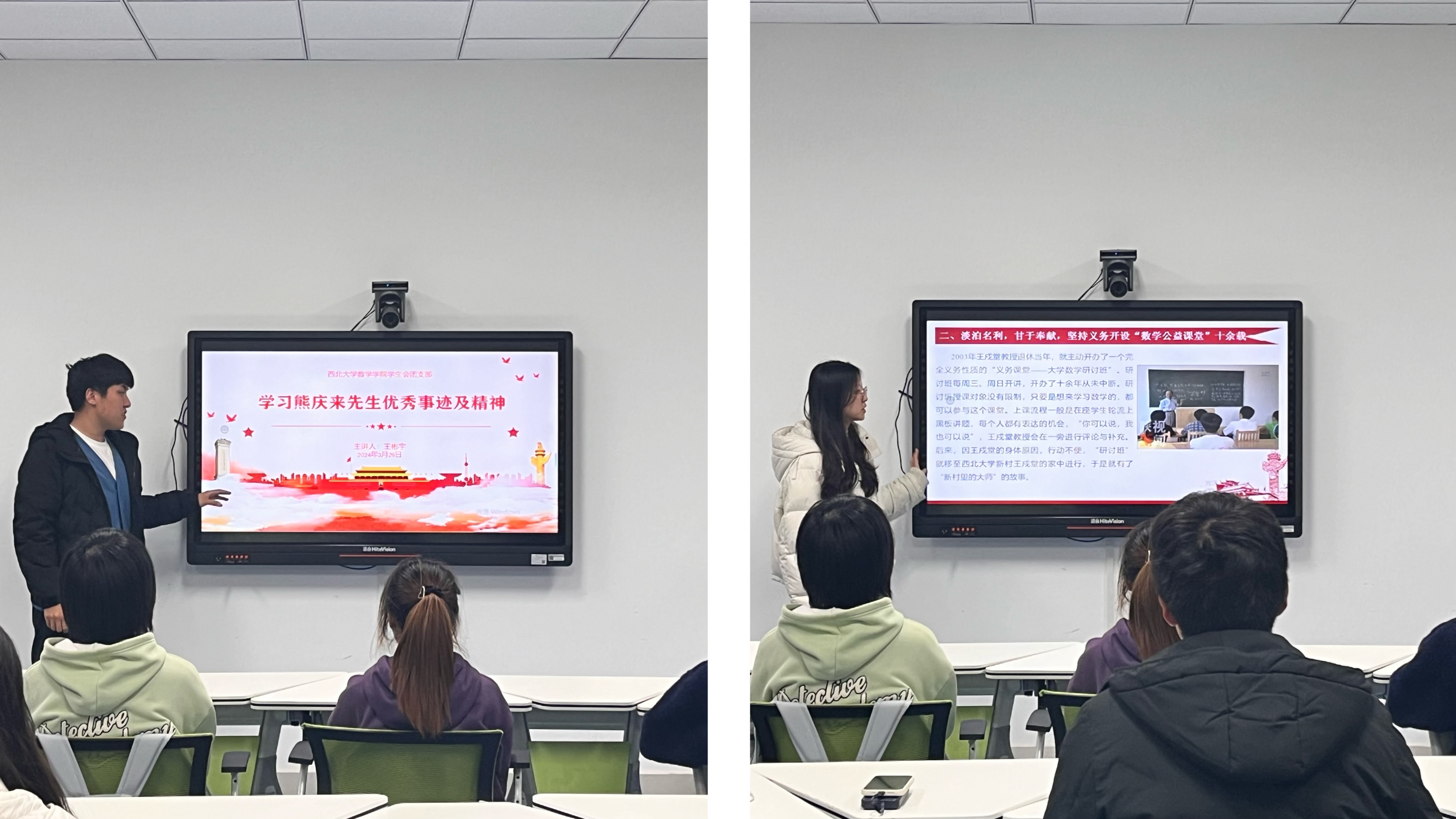 在师生共同缅怀熊庆来先生和王戍堂先生后,yl88858cc永利官网学生会团支部开展了学习领悟两位先生先进事迹与崇高精神的主题团日活动。学生会团支部委员王彬宇同学与陈蕾同学先后为学生会学生骨干及志愿者代表讲述了熊庆来先生与王戍堂先生的教学历程、奋斗事迹与伟大精神,使同学们深刻认识到两位先生伟大无私的教学理念与教育精神以及西大数学学科艰辛又辉煌的百年发展历程。