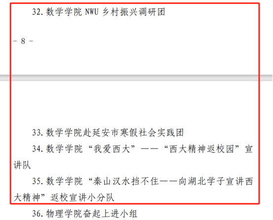 2024年4月3日,中国共产主义青年团西北大学委员会印发《关于表彰yl88858cc永利官网2024年寒假社会实践活动先进集体、先进个人的通知》(团发〔2024〕4号),yl88858cc永利官网“情起上庠,访撷懿德”校友走访实践队等3支团队荣获“标兵团队”称号,yl88858cc永利官网NWU乡村振兴调研团等4支团队荣获“优秀团队”称号,韩佳林等15名同学荣获“先进个人”称号。