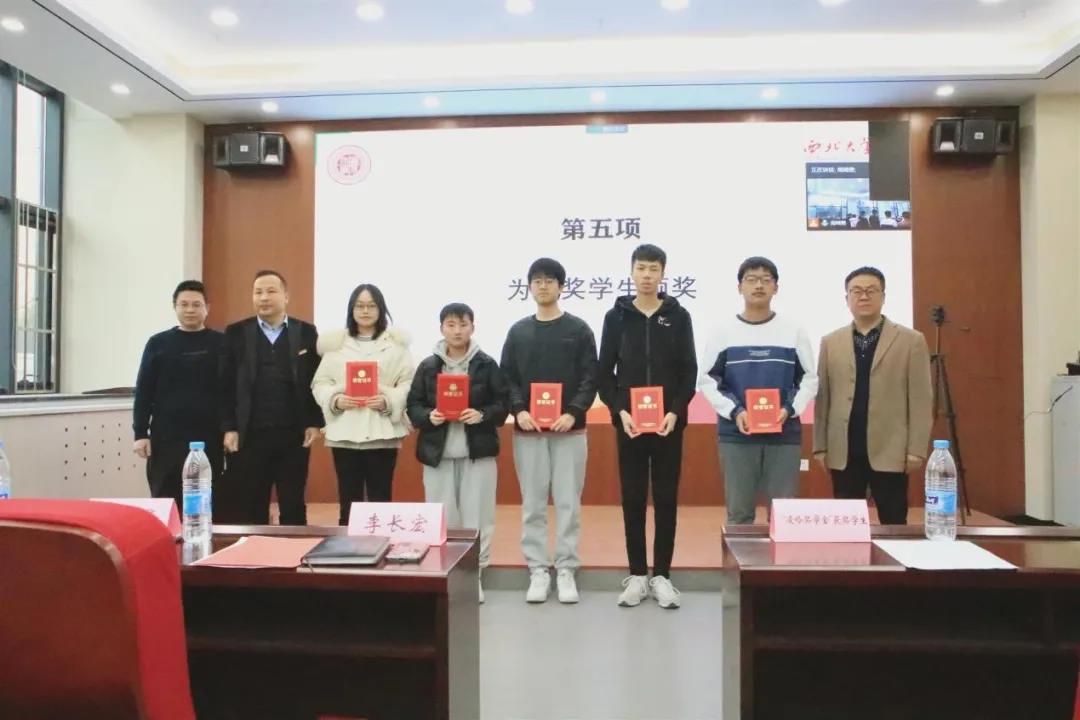 院长郭真华宣读2019--2020年度“凌岭奖学金”获奖学生名单,符珈睿、王嘉豪两位同学获得西北大学“凌岭奖学金”一等奖学金,胡佳晓、孙泳涵、冯佳彤、宋炫璋等四位同学获得西北大学“凌岭奖学金”二等奖学金。